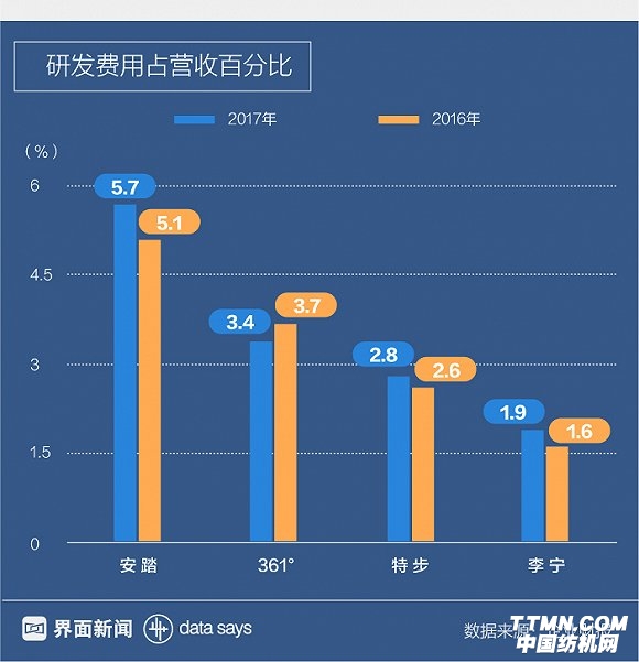 隨著主流消費群體的運動層次和產品要求不斷提高,各大運動品牌愈發注重產品研發創新。從2009年起,安踏的研發活動成本比率連續9年處在上升趨勢,為國內行業第一。李寧的研發投入雖然有所增長,但其比例在四大品牌中墊底。