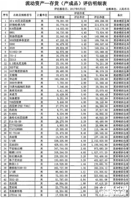 英奇倉庫存貨評估明細表中包含各種規格型號的滌棉、四面彈等布匹,或許由于“買到就是賺到”的心態,此次拍賣競爭異常激烈,競買記錄達291次,成交價高出起拍價300萬。部分存貨如下:
