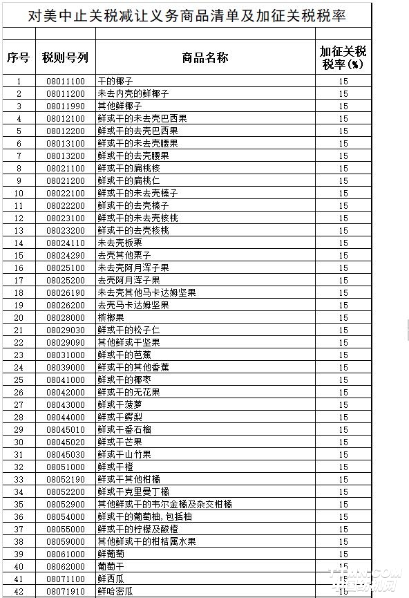 財政部認為,232措施違反了世界貿易組織相關規則,不符合“安全例外”規定,實際上構成保障措施。該措施已于3月23日起實施,對我國利益造成嚴重損害。為維護我國利益,平衡因美國232措施給我國利益造成的損失,我自2018年4月2日起對原產于美國的7類128項進口商品中止關稅減讓義務,在現行適用關稅稅率基礎上加征關稅,對水果及制品等120項進口商品加征關稅稅率為15%,對豬肉及制品等8項進口商品加征關稅稅率為25%。現行保稅、減免稅政策不變。