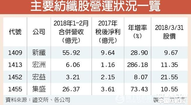 受惠聚酯纖維、加工絲價格好轉,相關族群新纖(1409)、宏洲(1413)、宏益(1452)、集盛(1455)、宜進(1457)等個股去年毛利率、營益率及純益率三升,在景氣回溫、國外大廠停產,加上大陸供給在當地嚴稽環(huán)保下受到控制,今年來聚酯相關產品價格仍比去年處于相對高檔,市場預期,國內聚酯、加工絲廠今年營運仍有看頭,成長性高。