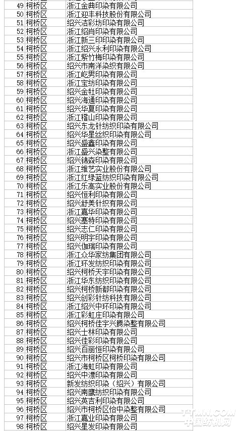 2018年3月30日,紹興環保局根據《企業事業單位環境信息公開辦法》(部令第31號)和《關于印發〈2018年紹興市重點排污單位名錄〉的通知》(紹市環發〔2018〕16號),公布2018年度全市重點排污單位名錄,其中水環境重點排污單位345家,小編通過整理,其中,印染企業共計219家,下面是詳細名單: