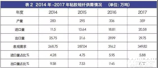 1.3 出口量占產(chǎn)量權(quán)重?。何覈m然是粘膠短纖大國,但在世界市場上我國的粘膠短纖占有率并不是太高。從2014年-2017年我國粘膠短纖使用量表觀數(shù)據(jù)看,近幾年我國粘膠短纖進(jìn)口量占表觀需求量平均比例在5%附近,出口量占表觀需求量平均比例在9%附近。且根據(jù)不同的年份,粘膠短纖出口量還有所起伏,如2015年與2017年,出口比例均比2014年與2016年出現(xiàn)了1%~2%的下降。