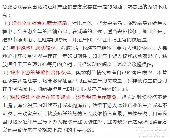 3.1 盡快形成行之有效的銷售方案:粘膠短纖市場價格波動頻發(fā),價格差大,主要原因在于產(chǎn)品銷售方案上存在一定的漏洞。而這些漏洞一旦被市場貿(mào)易商以及資金盯上的時候,就容易形成炒作的因素。市場經(jīng)濟(jì)條件下,想要杜絕資金熱炒某個品種,基本不可能。而且價差長期沒有波動,產(chǎn)品也難以被廣泛應(yīng)用。