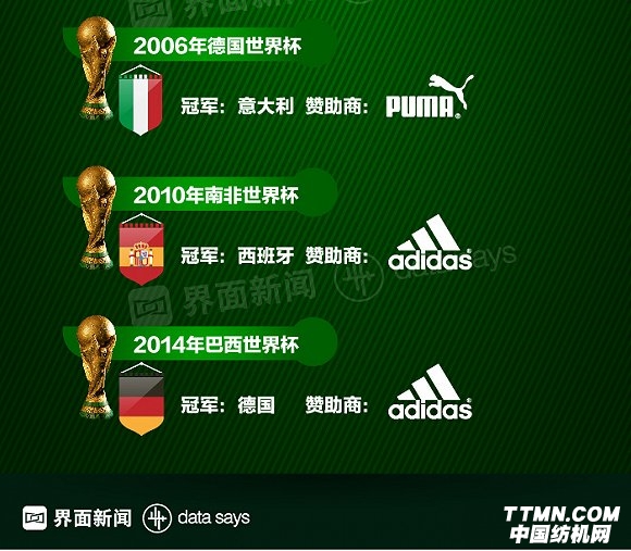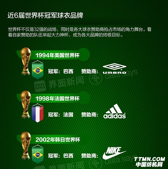 看著自家贊助的隊伍舉起大力神杯,并以此刺激足球生意,成為各大品牌在世界杯戰場的終極目標。過去6屆世界杯,阿迪達斯的球隊曾3次登頂,依然是主要贏家。耐克、PUMA和Umbro,各自握有一次勝利。
