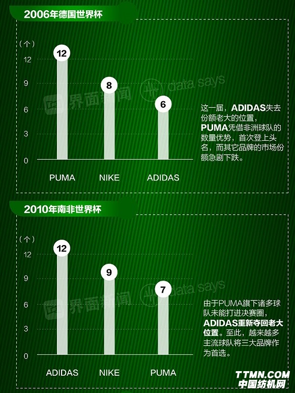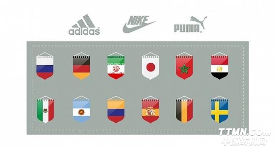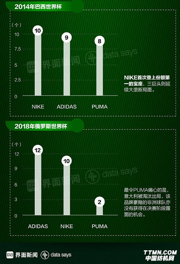 進入決賽圈的32個國家隊球衣,總共由9個不同的運動品牌贊助。兩大國際品牌阿迪達斯和耐克占據大頭,分別擁有12支和10支隊伍。作為世界杯傳統贊助大牌,PUMA這一次則遭遇滑鐵盧,損失了意大利和非洲諸隊,手上進入決賽圈的球隊僅剩2支。