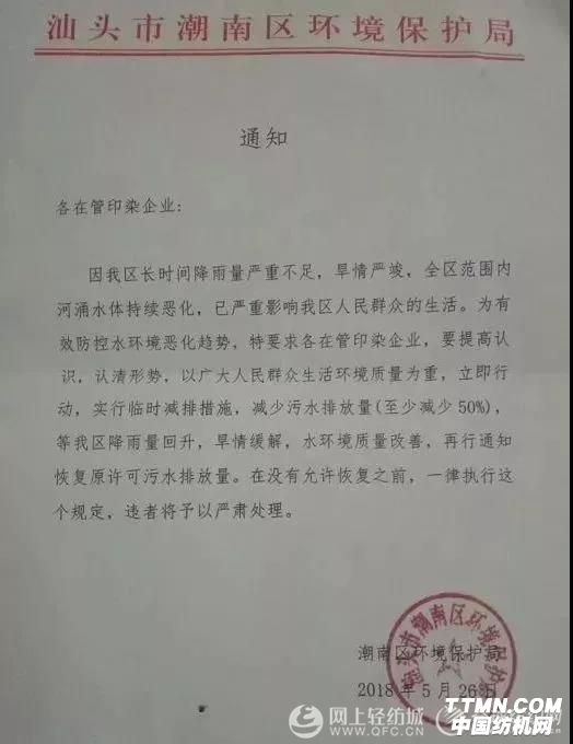 5月26日,汕頭市潮南區(qū)環(huán)境保護局發(fā)出通知,因旱情嚴重,全區(qū)范圍內(nèi)河涌水體持續(xù)惡化,為有效防控水環(huán)境惡化趨勢,特要求印染企業(yè)實行臨時減排措施,至少減少50%的污水排放量,等水環(huán)境質(zhì)量改善,再恢復原許可污水排放量。