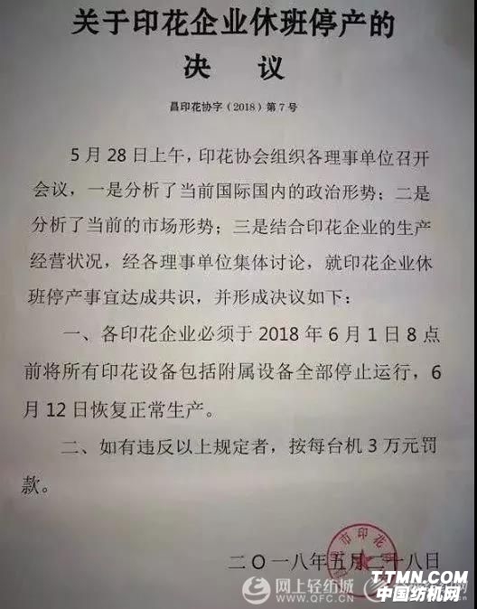 5月28日,昌邑印花協(xié)會召開會議決定,各印花企業(yè)必須于2018年6月1日8點前將所有印花設(shè)備包括附屬設(shè)備全部停止運行,6月12日恢復正常生產(chǎn),違反者每臺機器罰款3萬元。