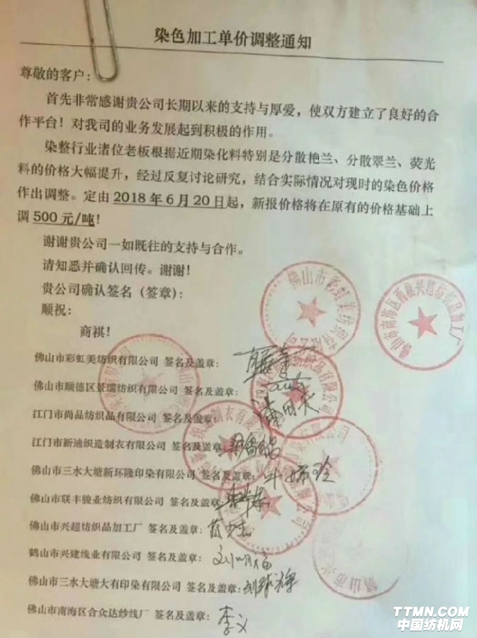 繼6月2日江蘇南通7家印染廠、6月12日8家印染企業齊發漲價通知后,廣東佛山、江門10家印染廠再次齊發漲價通知:6月20日起,新報價格將在原有的價格基礎上調500元/噸。