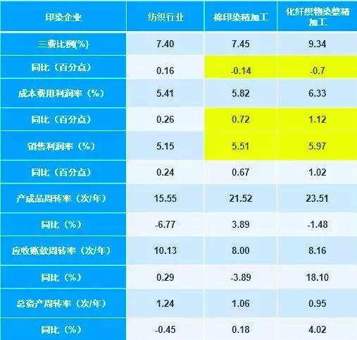 2018年,印染行業(yè)運(yùn)行質(zhì)效繼續(xù)改善。三費(fèi)比例進(jìn)一步下降,管理水平穩(wěn)步提升。銷售利潤(rùn)率提高,贏利能力進(jìn)一步增強(qiáng)。應(yīng)收賬款周轉(zhuǎn)率、總資產(chǎn)周轉(zhuǎn)率提高,運(yùn)營(yíng)效率逐步提高。企業(yè)生產(chǎn)運(yùn)營(yíng)及市場(chǎng)銜接狀況均較為順暢,運(yùn)行質(zhì)量穩(wěn)步改善是印染行業(yè)經(jīng)濟(jì)運(yùn)行的一大亮點(diǎn)。