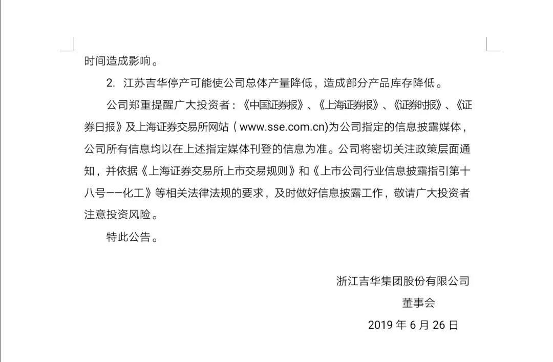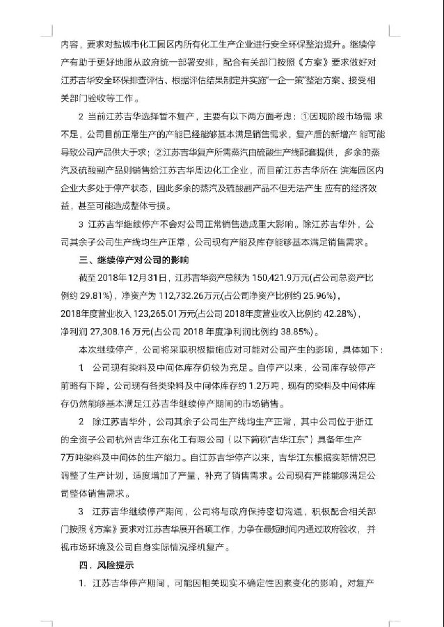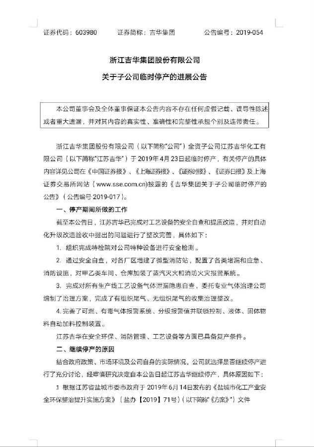 吉華集團表示,截至本公告日,江蘇吉華已完成對工藝設備的安全自查和提質改造,并對自動化升級改造驗收中提出的問題進行了整改完善,江蘇吉華在安全環保、消防管理、工藝設備等方面已具備復產條件。根據鹽城市委市政府于2019年6月14日發布的《鹽城市化工產業安全環保整治提升實施方案》,要求對鹽城市化工園區內所有化工生產企業進行安全環保整治提升。公司選擇繼續停產以便更好地服從政府統一部署安排,配合做好江蘇吉華安全環保排查評估,以及根據評估制定整治方案、接受相關部門驗收等工作。