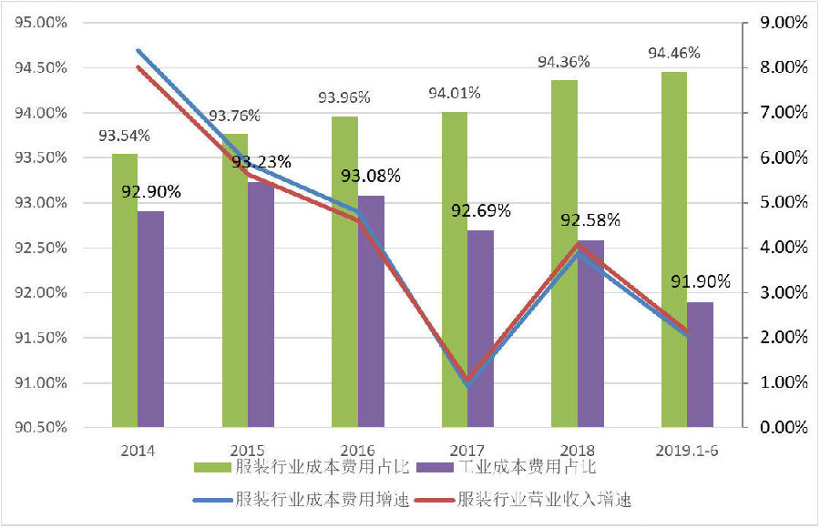由于用工、融資、稅收、原材料、能源等成本費(fèi)用的持續(xù)增長(zhǎng),企業(yè)綜合運(yùn)營(yíng)成本不斷提升。據(jù)國(guó)家統(tǒng)計(jì)局?jǐn)?shù)據(jù)顯示,2019年1-6月,我國(guó)規(guī)模以上服裝企業(yè)累計(jì)成本費(fèi)用同比增長(zhǎng)2.04%,增長(zhǎng)幅度僅比營(yíng)業(yè)收入增幅略低0.11個(gè)百分點(diǎn)。從成本費(fèi)用占主營(yíng)業(yè)務(wù)收入的比重變化來(lái)看,全國(guó)規(guī)模以上工業(yè)企業(yè)的平均水平逐年下降,而服裝行業(yè)的該項(xiàng)比重呈現(xiàn)了不斷上升的態(tài)勢(shì),成本費(fèi)用的快速上漲進(jìn)一步擠壓了服裝企業(yè)的利潤(rùn)空間。