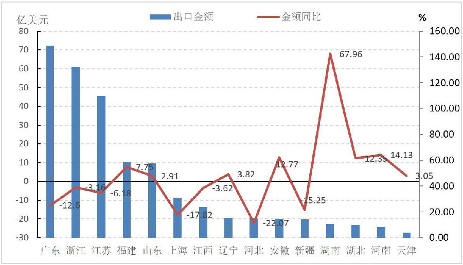 2019年1-6月,我國(guó)服裝出口前五大省市完成服裝出口507.57億美元,同比下降5.08%,占出口總額的76.24%。其中,廣東省降幅明顯;浙江、江蘇小幅下降,而福建、山東服裝出口持續(xù)低速增長(zhǎng)。在中部省市中,安徽、湖南、湖北、河南服裝出口呈現(xiàn)兩位數(shù)增長(zhǎng),湖南省增速最快,增幅高達(dá)67.96%。
