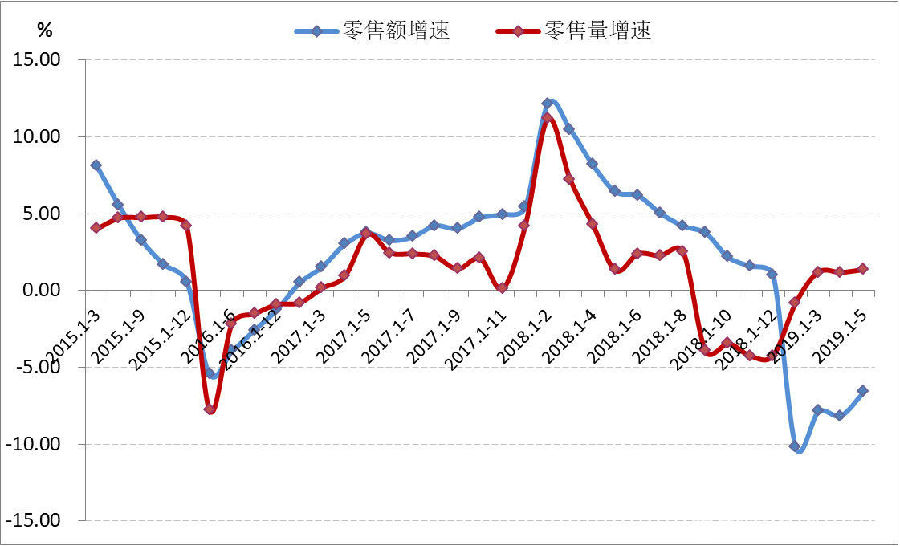 傳統(tǒng)渠道中,大型零售企業(yè)服裝銷售量升價(jià)跌,銷售額增速轉(zhuǎn)負(fù)。根據(jù)中華全國(guó)商業(yè)信息中心的統(tǒng)計(jì),2019年1-5月全國(guó)重點(diǎn)大型零售企業(yè)服裝類商品零售額同比下降6.64%,比上年同期回落13.08個(gè)百分點(diǎn),各類服裝零售量同比增長(zhǎng)1.37%,比上年同期提高0.06個(gè)百分點(diǎn)。