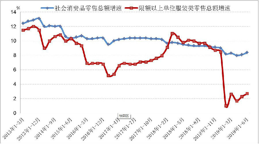 社會(huì)消費(fèi)品及服裝類零售總額累計(jì)增速情況