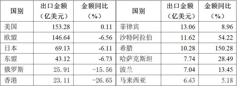 1、對(duì)美出口微弱增長(zhǎng),其他主要市場(chǎng)下跌明顯