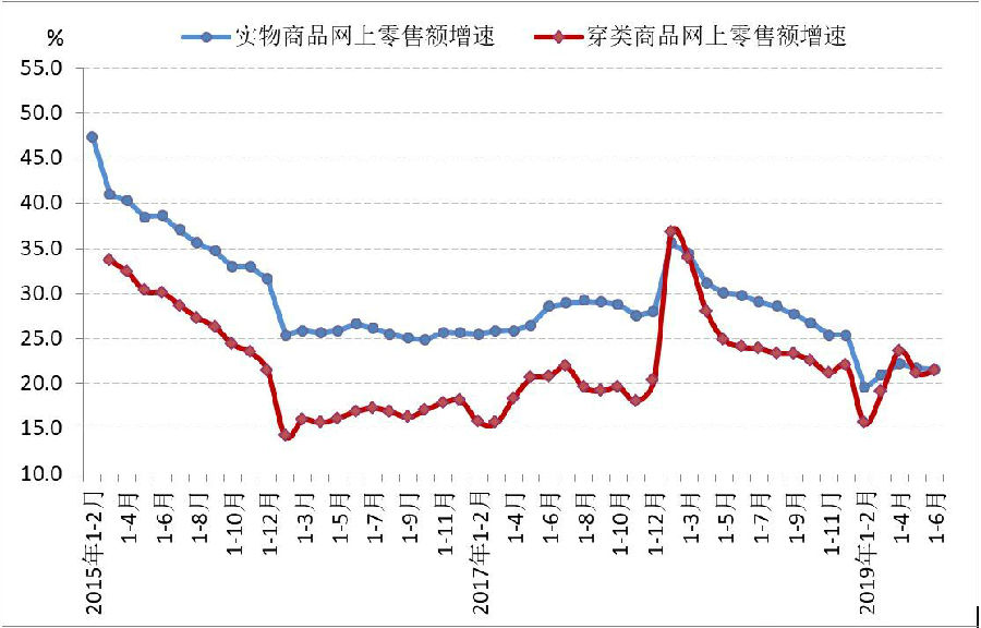 實(shí)物及穿類商品網(wǎng)上零售額增長(zhǎng)情況