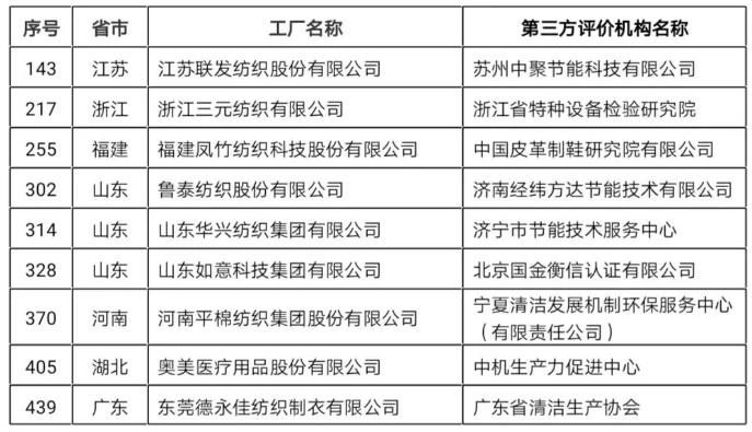 名單內江蘇聯發、浙江三元、福建鳳竹、魯泰紡織、山東華興、山東如意、河南平棉、奧美醫療、東莞德永佳9家棉紡織企業均為中國棉紡織行業協會會員單位,成功入選工業和信息化部綠色工廠名單。