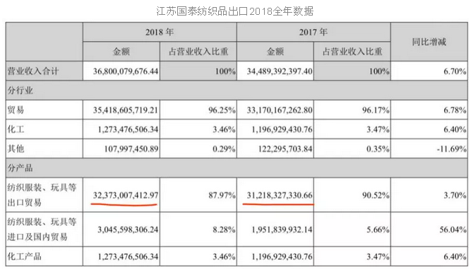 江蘇國泰(002091.SZ)也是國內主要的紡織品出口商,2018年全年紡織品出口同比增3.70%。