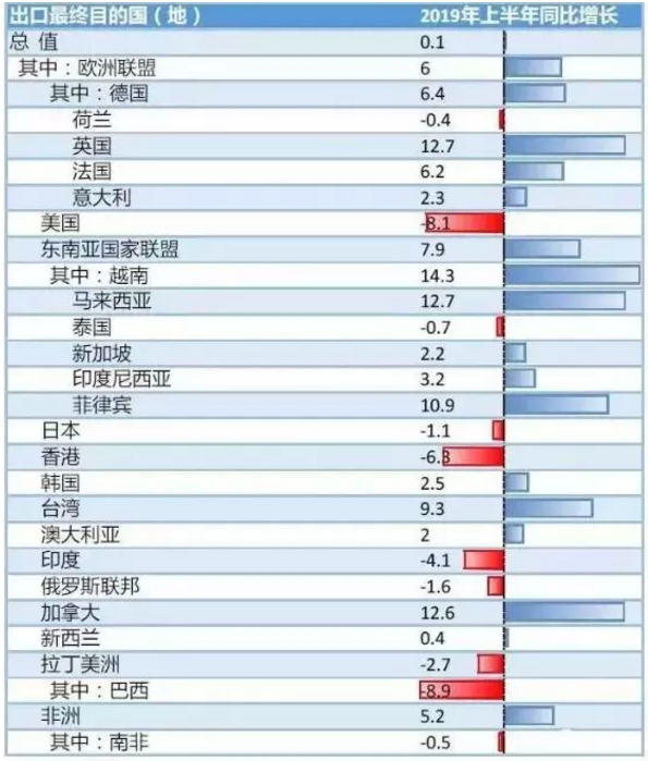 值得注意的是,2019年上半年中國對美國出口下降8.1%;與此同時,對歐盟出口增長6%;對東盟出口增長8%,其中,對越南的出口額增長了14%!