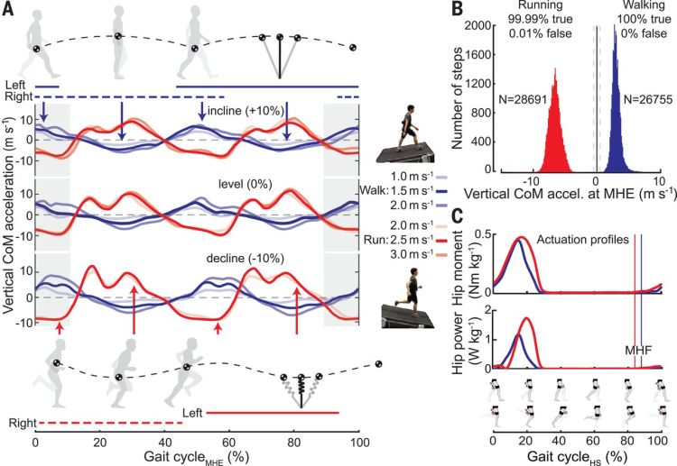 走路時,人體的質心移動就像一個“倒立擺”(圖A上部),隨著兩只腳的前后移動發生偏移。