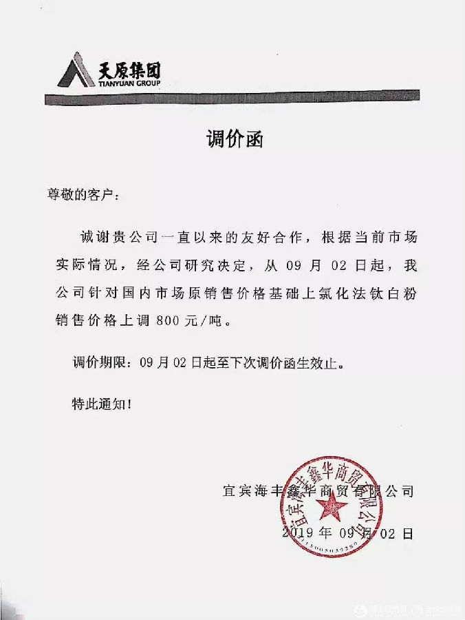 宜賓海豐鑫華商貿有限公司(以下簡稱“海豐鑫華”)發布調價函稱,根據當前市場實際情況,經研究決定,自9月2日起,針對國內市場原銷售價格基礎上氯化法鈦白粉銷售價格上調800元/噸。