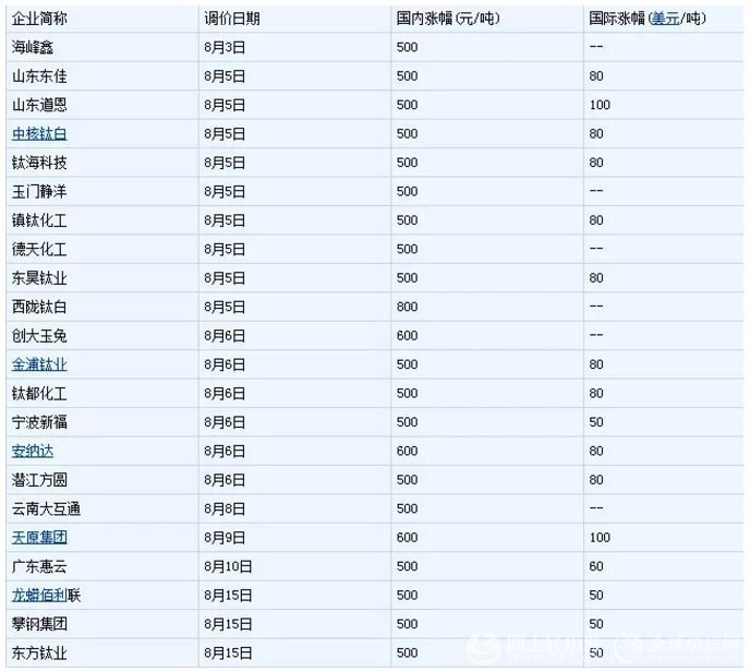 此前在8月8日,海豐鑫華就發布過調價函,稱自8月9日起,其在原銷售價格基礎上氯化法鈦白粉銷售價格上調600元/噸,國外市場上調100美元/噸。