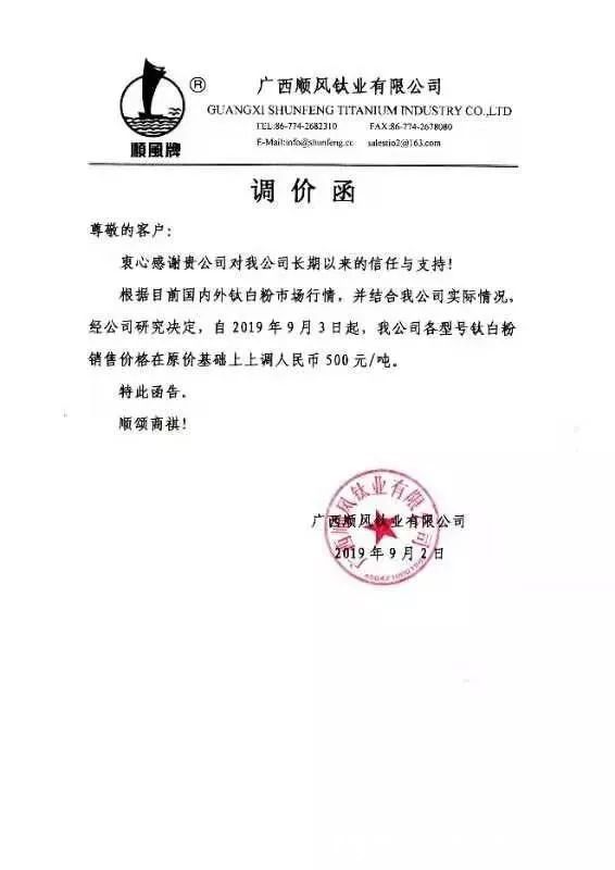 廣西順風鈦業有限公司(簡稱“順風鈦業”)于9月2日發布的調價函內容顯示,基于當前的市場行情,并結合該公司的實際情況,經研究決定,從9月3日起,順風鈦業各型號鈦白粉銷售價格在原價基礎上上調人民幣500元/噸。