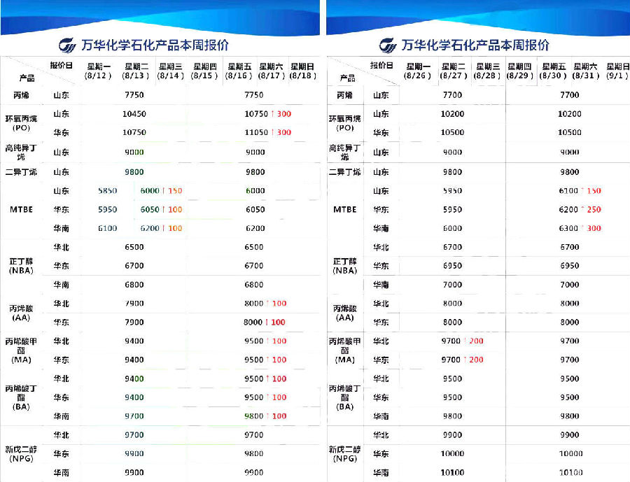 丙烯酸甲酯(MA)也經歷了兩次漲價,華北地區、華東地區價格均上調100元/噸漲至9500元/噸,而后上調200元/噸漲至9700元/噸;