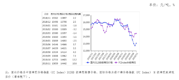 (一)國內(nèi)棉價(jià)小幅上漲。受中美同意隨談判協(xié)議進(jìn)展分階段取消加征關(guān)稅消息和輪入50萬噸新疆棉公告發(fā)布影響,國內(nèi)棉花現(xiàn)貨價(jià)格有所回升,并帶動籽棉收購價(jià)走高。11月國內(nèi)3128B級棉花月均價(jià)每噸13059元,環(huán)比漲2.6%,同比跌16.1%。鄭棉期貨主力合約(CF001)月結(jié)算價(jià)每噸12785元,環(huán)比跌2.6%,同比跌12.1%。
