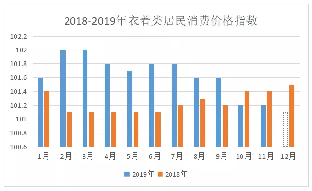 從表中可見,2018年下半至2019年上半年期間,居民在衣著類的消費指數大幅上升,市場需求不斷放大。但從2019年下半年開始,我國居民在衣著類的消費價格指數呈直線式下降,雖然目前2019年12月份的數據還沒出來,但綜合整體情況來看,并不會很高,大概率依舊是下降態勢。