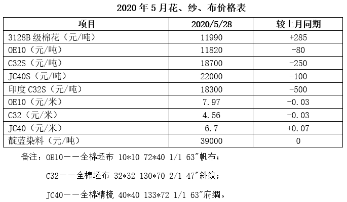 5月,國內棉花現貨價格小幅振蕩上漲,市場少量成交;紗線市場行情略有好轉,常規品種銷售情況較好,價格偏弱;坯布市場內銷訂單稍見起色,產能利用率維持穩定,市場信心有所恢復。