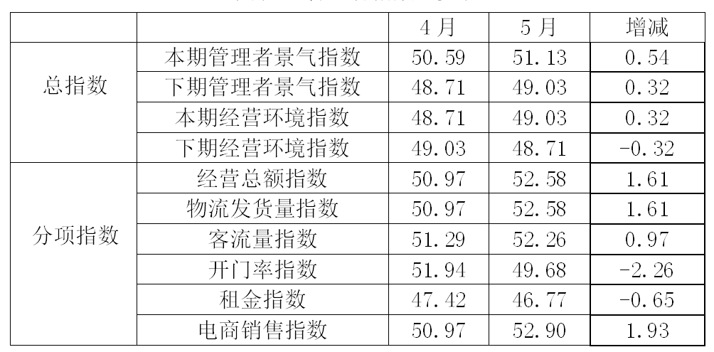 從商戶景氣指數(shù)來看,總指數(shù)中,5月商戶景氣指數(shù)為50.13,比4月的48.92上升1.21個百分點;經(jīng)營環(huán)境指數(shù)為48.83,比4月的47.55上升1.28個百分點。