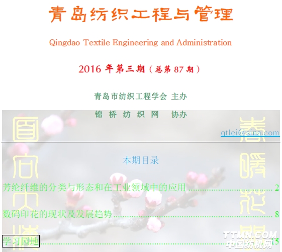 由青島市紡織工程學(xué)會主辦、錦橋紡織網(wǎng)協(xié)辦的《青島紡織工程與管理》電子期刊于2009年1月正式創(chuàng)刊。該刊由青島市紡織工程學(xué)會秦志強(qiáng)工程師任主編。該刊除以電子郵件形式發(fā)送至?xí)T單位外,還在錦橋紡織網(wǎng)開設(shè)專門窗口供業(yè)內(nèi)人士進(jìn)行瀏覽與查閱。該刊的創(chuàng)辦定能為廣大紡織業(yè)技術(shù)人員提供1個技術(shù)交流平臺,為我國紡織業(yè)技術(shù)創(chuàng)新起到積極作用。