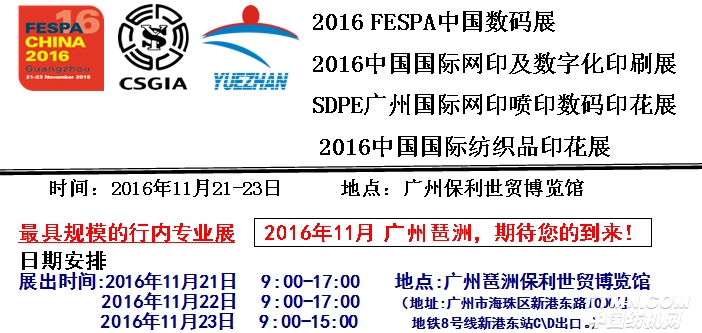 本次展會是中國網印及制像協會(CSGIA)與歐洲網印數碼聯合會(FESPA)合作的歐亞大展,將于2016年11月21-23日在廣州琶洲保利世貿博覽館舉辦。展會至今已成功舉辦29屆,成為業界公認的品牌展會,本次展會將匯聚全球主流紡織品印花、絲網印刷以及數碼噴印技術名企,集中展示最前沿的紡織品數碼印花設備、大幅面數碼噴印設備、絲網印刷設備器材及材料、萬能彩印設備器材。