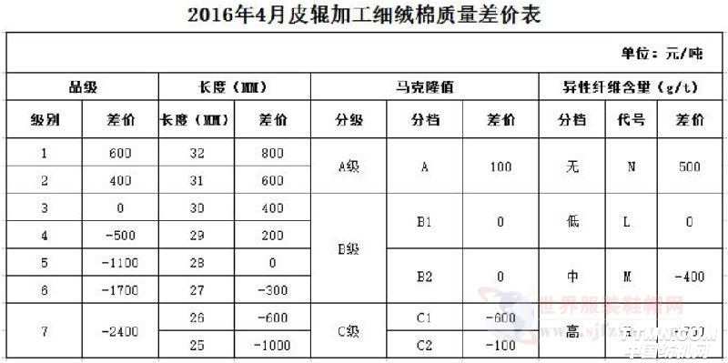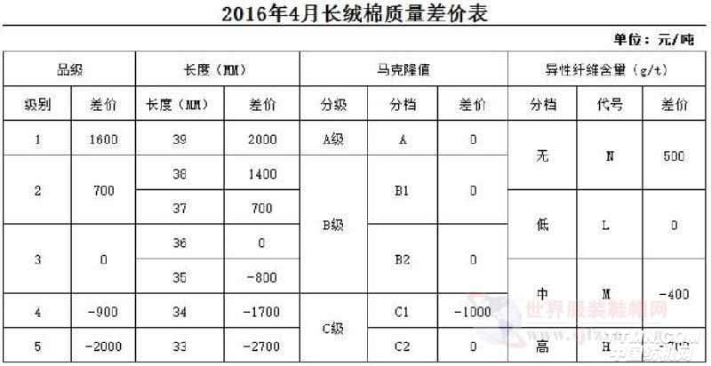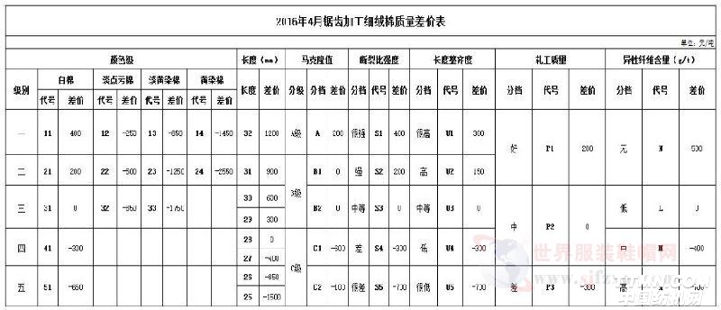 2016年4月《中國棉花協會國產棉質量差價表》保持不變,各指標價差幅度維持3月份水平。