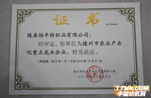 4月4日,陵縣恒豐紡織在陵城區(qū)農(nóng)業(yè)局成功拿到了“德州市農(nóng)業(yè)產(chǎn)業(yè)化龍頭企業(yè)”榮譽(yù)證書。陵縣恒豐紡織經(jīng)過不懈的努力,經(jīng)德州市農(nóng)業(yè)產(chǎn)業(yè)化工作領(lǐng)導(dǎo)小組審定,被評(píng)為2016年度“德州市農(nóng)業(yè)產(chǎn)業(yè)化龍頭企業(yè)”。