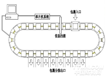 每個郵包面上均貼有條形碼,由上件裝置將郵包輸送到分揀裝置上,分揀用的皮帶輸送機由鏈條牽引,在分揀軌道上移動,經過條形碼掃描儀時,郵包分揀信息由條形碼掃描儀采集到計算機控制系統中,在其中進行數據分析處理,由單片機控制計算出郵包到達指定分揀格口所需要的時間,以便郵包到達分揀格口時計算機控制系統發出信號,通過控制電動滾筒啟動皮帶輸送機把郵包分揀到指定格口達到分揀目的。如下圖所示。