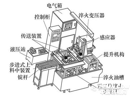 對于錠桿來說,采用一次感應穿透加熱是有很大難度的,因為錠桿的外形為不同錐度的細長形桿件,其二個端頭分別為60°和90°的錐形,它們的硬度和金相組織必須達到技術要求,特別是60°下錠尖的淬火硬度必須保證≥62HRC,這就需要設計一個特殊形狀的感應器,而且每種規格的錠桿需要配備相應的感應器,對于尺寸相近的錠桿基本可以借用,為了與臥式淬火機床相配合,感應器和錠桿也必須臥式擺放的,要使整根不同錐度外形的錠桿能夠加熱均勻,又不能使二個錠尖在加熱時出現的欠熱或過熱組織,這就需要感應器的形狀與錠桿的外形基本上相近,所以感應器要做成軸類縱向加熱感應方式,即可以調整縱向長度的一發法式感應器,整根錠桿還必須能夠旋轉,旋轉的方式是靠二個V型頂尖通過變頻電機帶動,使其旋轉速度在60~70r/min,電加熱功率為100kW,頻率20kHz,根據產品的技術要求調整相應的參數,在加熱時溫度的控制通過電流比率來達到,它的透入深度根據導磁率比電阻的大小來調整,在保證加熱穿透的前提下,其加熱溫度為880~920℃,加熱時間為10~12s/每根,每臺設備每月產量可以達到15~18萬件。整個生產線如圖所示。它的操作程序是:操作者將錠桿擺放在步進式進料裝置上,并自動送入U形槽中,由提升機構將錠桿上升到雙V型頂尖位置,然后雙V型頂尖夾緊,由絲桿導軌和伺服電機組成的傳輸裝置將錠桿轉移到感應器下面進行旋轉感應穿透加熱,然后由絲桿模組快速下降并將錠桿送入五工位淬火矯直機中的第一個工位中進行邊淬火邊矯直。