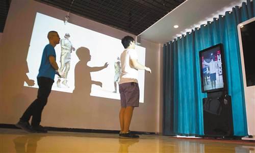 7月18日,巴南區重慶中國輕紡服裝城,顧客在立泰服飾集團的展廳里體驗換衣“魔鏡”。