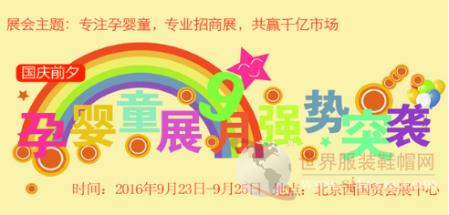 近兩年,國家針對嬰幼兒產業的種種利好政策母嬰市場引起巨大波瀾,也為幼兒教育行業帶來了新的春天。孕嬰童用品店和幼教機構如雨后春筍般出現。在幼兒教育和孕嬰童產業發展的黃金時期,由北京國家發改委、商務部、貿促會等8大部委和行業協會等權威機構參與,2016全國孕嬰童用品招商加盟展覽會將于國慶前夕,2016年9月23-25日在北京西國貿會展中心強勢突襲。招商工作已經如火如荼的進行,專業觀眾邀請工作也正在火熱進行中。