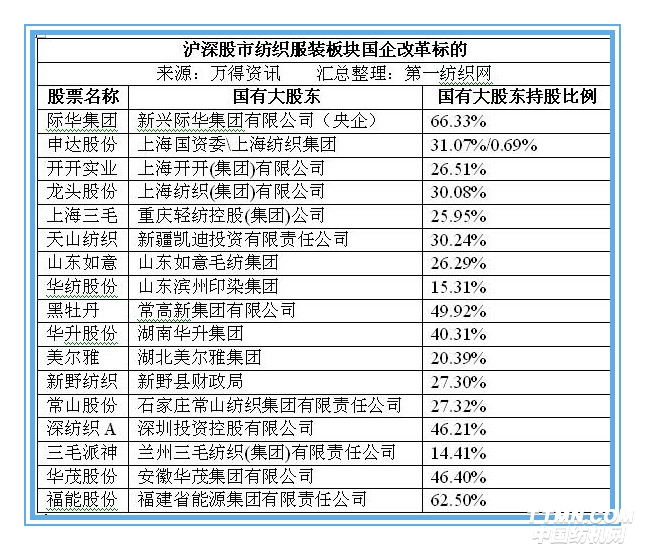 光大證券研究員李婕表示,整體來看,紡織服裝行業具有門檻低、集中度低、民營企業居多的特點,但由于歷史原因仍存在部分國資背景的紡織企業,主要分布在上海、山東等地區。而在整個國企央企大而不強、改革頻出的背景下,預計央企國企改革概念有望進一步升溫,具有國資背景的紡織服裝企業有望受益。