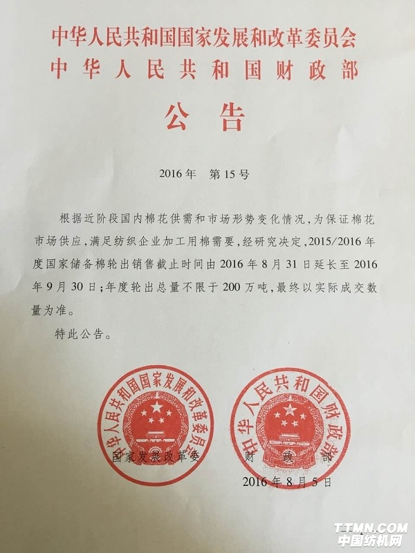 近日,國家發展改革委和財政部聯合發布公告,根據近階段國內棉花供需和市場形勢變化情況,為保證棉花市場供應,滿足紡織企業加工用棉需要,經研究決定,2015/2016年度國家儲備棉輪出銷售截止時間由2016年8月31日延長至2016年9月30日;年度輪出總量不限于200萬噸,最終以實際成交數量為準。