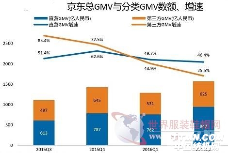 同比增長率能夠更好的反映這一情況,不論是GMV的總額還是總營收,近四個季度以來都保持在了下降通道中,分別降低到了40.1%與42.0%。唯一令人能夠保持樂觀態度的是京東自營渠道的GMV保持了堅挺,依然維持在接近50%的高位,同期第三方GMV則出現了大滑坡,增長率較上一季度下降接近一半。