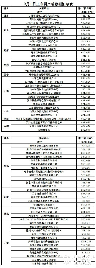 9月1日兩節共計輪出儲備棉30051.9250噸。9月1日第一節銷售儲備棉15013.0730噸,其中國產棉15013.0730噸、進口棉0噸。9月1日第二節銷售儲備棉15038.8520噸,其中國產棉15038.8520噸、進口棉0噸。
