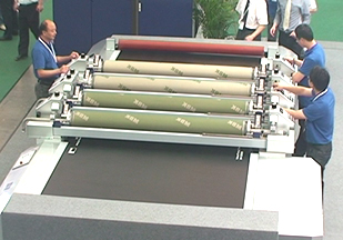 趙經理:我們現在主要的產品在這樣的,大家請看,這是我們的圓網印刷機,這是我們的平網印刷機,這是我們定型機,這臺圓網印刷機我們在中國原裝的賣了將近二百五六十臺,現在我們在國內組裝有賣了將近110多臺,展會以后我們要馬上突破120臺,這個設備主要的產品我們在國內組裝只是做一些架殼、機械的架子罩殼我們在國內生產,進口的像電機電器部分