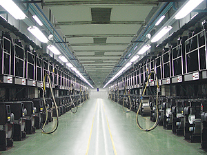 主要特點: ● 本系列機采用了新型節能型紡絲箱體,比普通紡絲箱節能25%。 ● 采用先進的下裝式杯形組件,提高了熔體在組件內流動的均勻性,板面溫度均勻一致,同時又減輕了 勞動強度。 ● 新型側吹風系統風速均勻穩定,纖維條干好。 ● 噴絲板下可調的無風區高度,給使深層次工藝調節成為可能。 ● 帶有精密卷繞的全自動換筒卷繞機,具有極高的切換成功率和優秀的底層絲退繞和過尾性能。