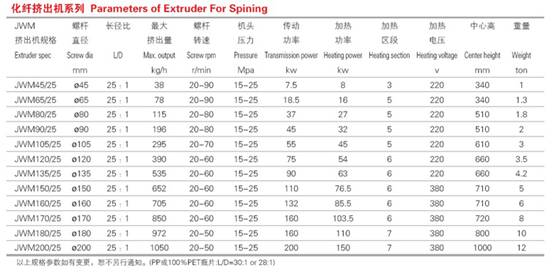 JWM系列螺桿擠出機主要用于PET、PA6、PA66、PP等切片的熔融紡絲。本產品集十幾年的經驗與技術,在行業中每年銷量巨大,目前已有數千臺擠出機在700多家化纖工廠及無紡布工廠正常運行。擠出機的螺桿設計采用LTM低溫混合元件,塑化性能好。由于采用了專業加工技術,使得螺桿、料筒的制造精度較高,直線性較好。并選用高精度斜齒減速箱,齒輪為硬齒面磨齒齒輪。工作平穩,噪聲極小。配用超強的推力軸承,保證能承受巨大的軸向力。并可根據用戶需要,選用進口軸承及密封件,耐用性好,維護簡便。
