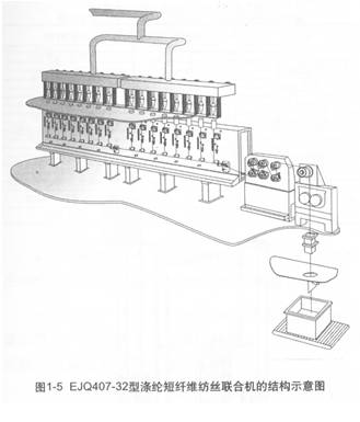 EJQ407-32型滌綸短纖維紡絲聯(lián)介機(jī)日產(chǎn)滌綸短纖維100噸,是近二年新開發(fā)的、帶有自主知識(shí)產(chǎn)權(quán)的新產(chǎn)品,經(jīng)過用戶廠近一年的運(yùn)轉(zhuǎn)考核,已通過了上海市經(jīng)委組織的生產(chǎn)鑒定。EJQ407-32型滌綸短纖維紡絲聯(lián)合機(jī)是由三臺(tái)單元機(jī)組成,即EJQ449-32紡絲機(jī)、EJQ458-32卷繞機(jī)和EJQ468-210絲桶往復(fù)裝置。其結(jié)構(gòu)示意圖見圖1-5。