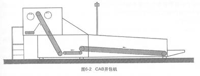 ·CAB開包機(圖6-2)??? 適用于任何種類和任何長度的纖維,標準工作寬度為1800-4500mm,生產能力達1500-4000kg/h。該開包機的開松是由PVC涂層木質板條制造的一角釘簾子與一個反向驅動的鍍鋅鋼釘實現。梳理輥和輸出輥是大直徑的,由獨立電機齒輪箱驅動。雙喂入輸送器由二個第一輸送器組成,輸送器是鍍鋅鋼板,標準長度5000mm,第二輸送器是PVC條板,標準長度1000mm。