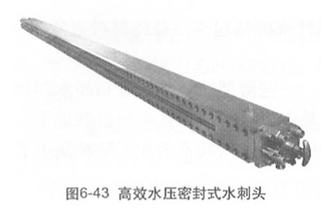 在水刺設(shè)備具體結(jié)構(gòu)方面,也作了很多技術(shù)改進(jìn)。水刺頭采用狹縫式出水腔設(shè)計(jì)結(jié)構(gòu),其高效水壓密封方式(圖6-43)新穎,高壓水泵采用變頻起動(dòng),由壓力傳感器反饋信號(hào),調(diào)節(jié)變頻裝置,這一技術(shù)提高了高壓水的穩(wěn)定性,并在低壓條件下也能獲得較好的纏結(jié)效果。該項(xiàng)技術(shù)已申請(qǐng)了國(guó)家專利。